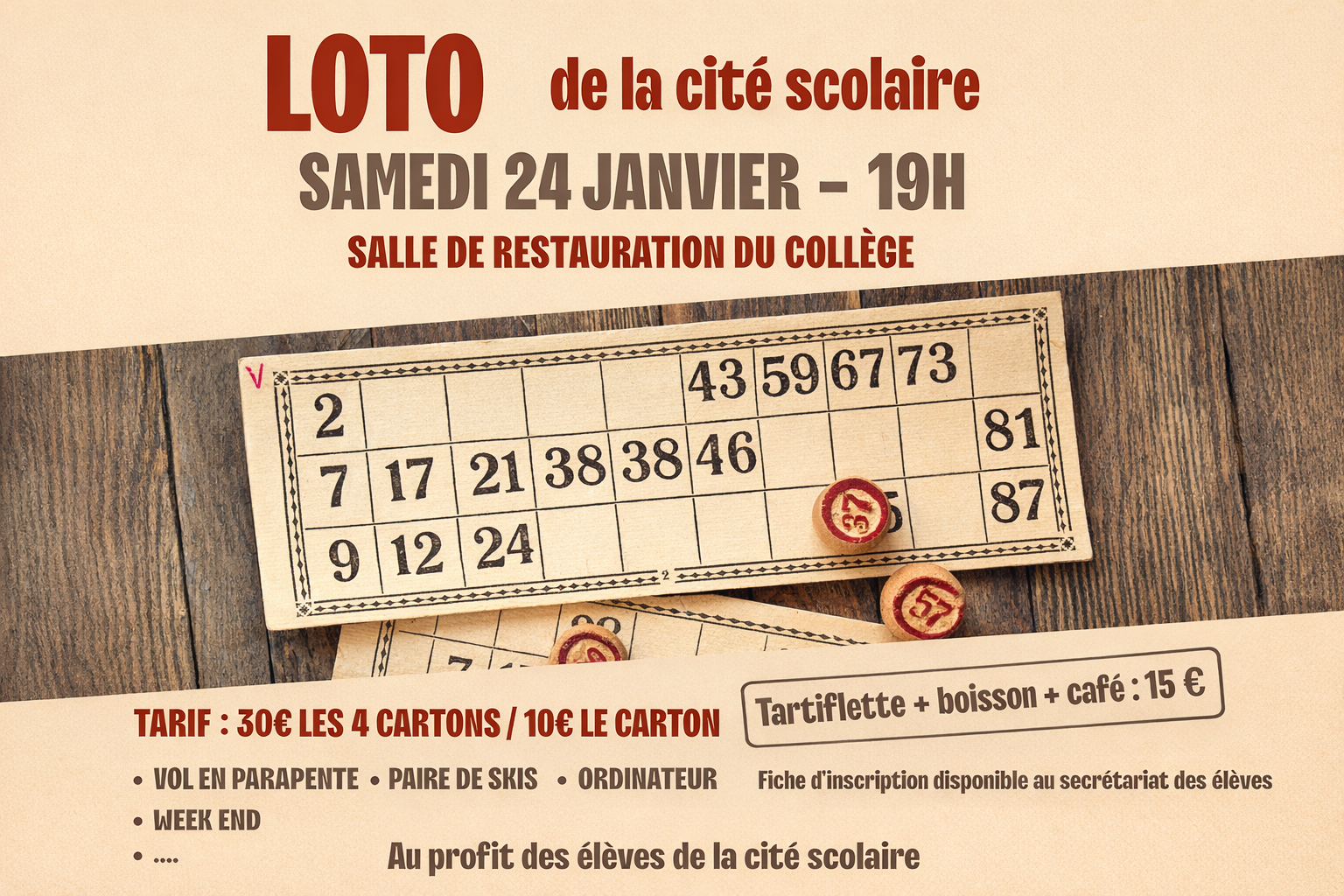 jeu, 15/01/2026 - 08:58Loto convivial ouvert à tous, au profit des projets et voyages scolaires.