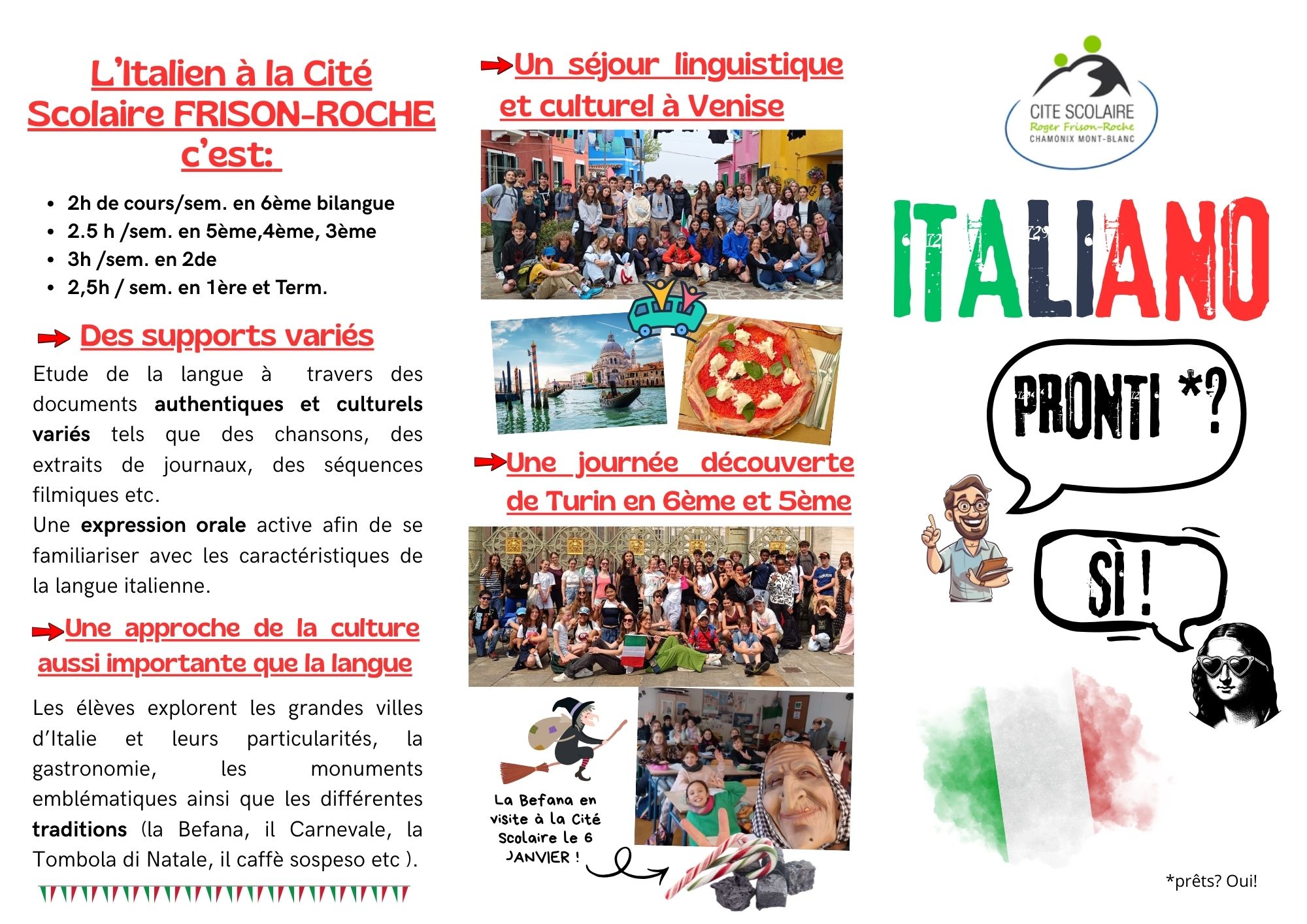 👉En classe de 6ème, les élèves béneficient de 2 heures d'italien par semaine, puis 2 heures et demies dans les autres niveaux.