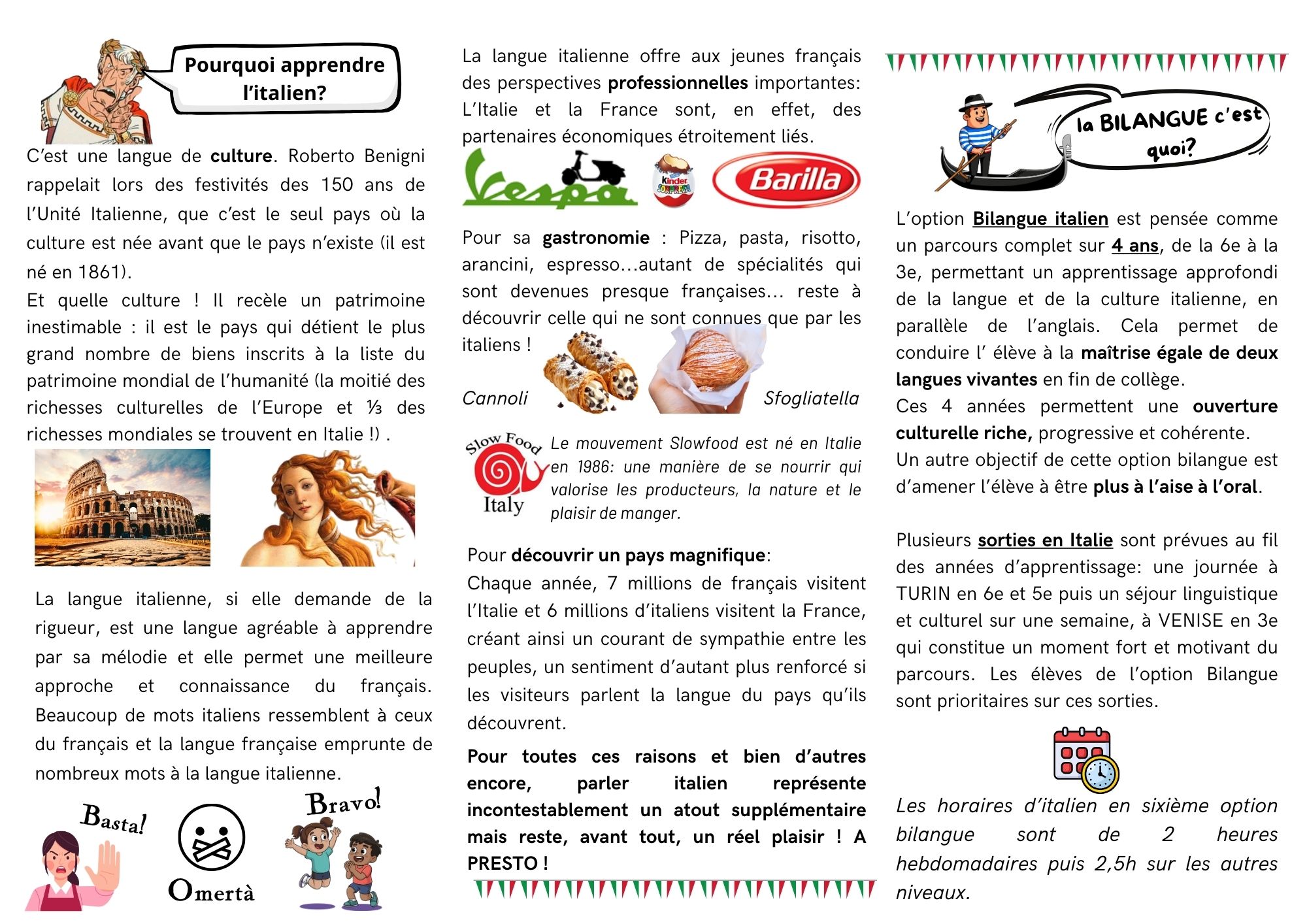 La classe bilangue Italien permet aux élèves d’apprendre deux langues vivantes dès la 6e, en associant l’italien à l’anglais. Elle ouvre la voie à la découverte d’une culture riche, d’une langue accessible et proche du français, et d’un patrimoine artistique majeur.